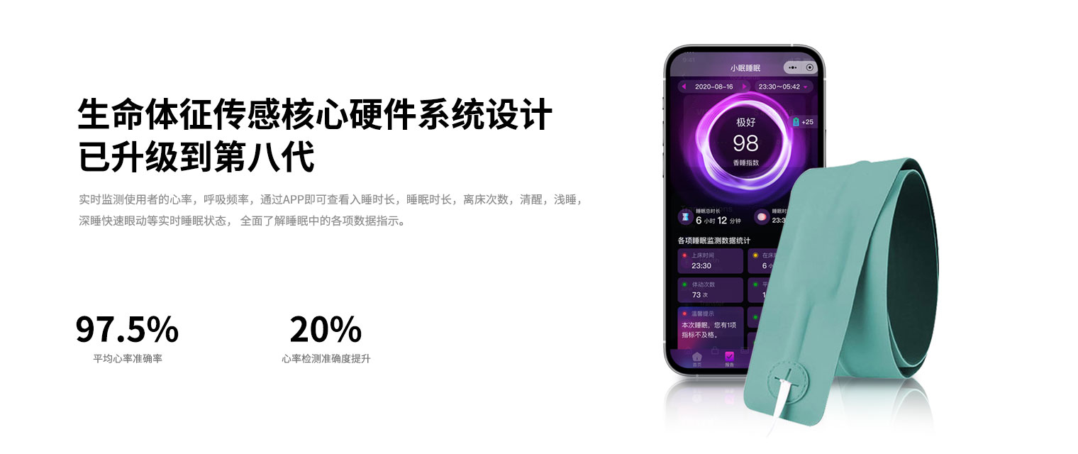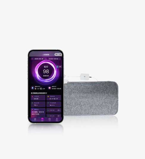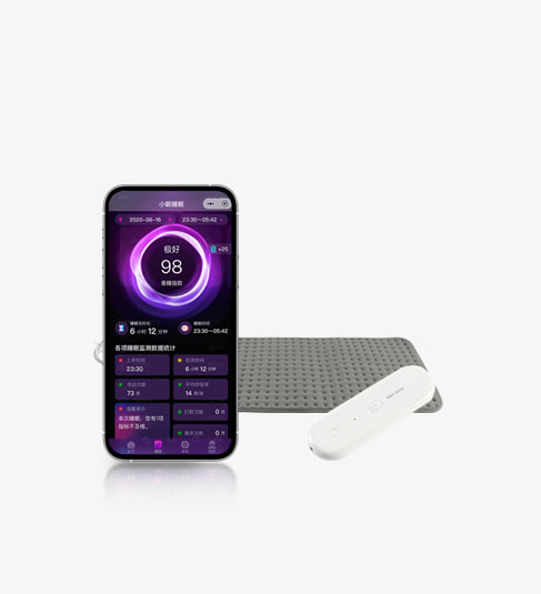 实时监测使用者的心率,呼吸频率,通过APP即可查看入睡时长, 睡眠时长,离床次数,清醒,浅睡,深睡快速眼动等实时睡眠状态, 全面了 解睡眠中的各项数据指示,给出风险提示及睡眠建议助力改善家人睡眠状况。